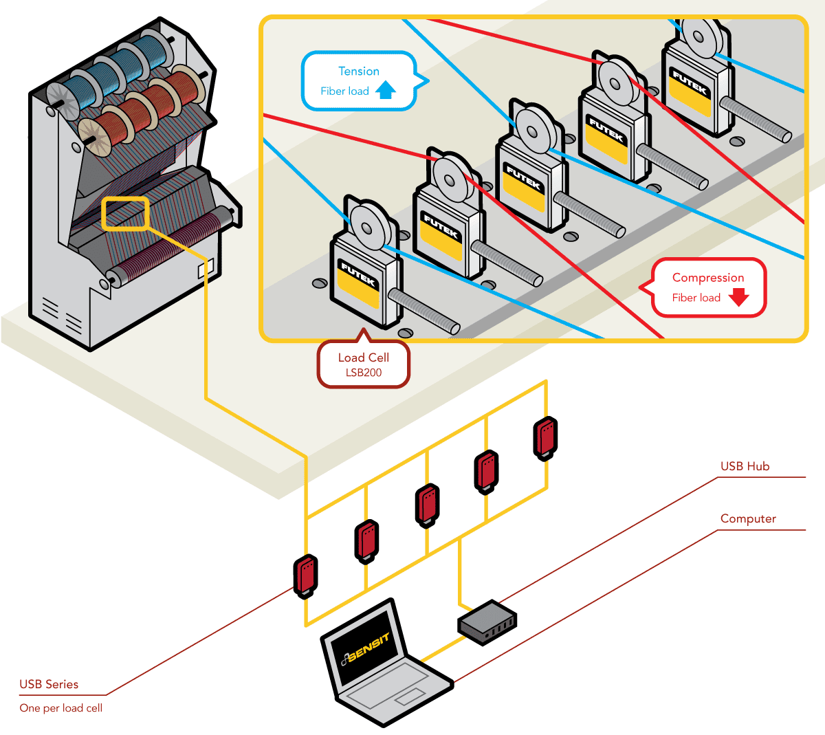 3、为了更有效更方便地测量纤维的拉压力,我们在LSB200上安装了滑轮配件。传感器尺寸小,非常容易整合到机器中去。(传感器尺寸平扁,我们可以将LSB200并排安装使用。)