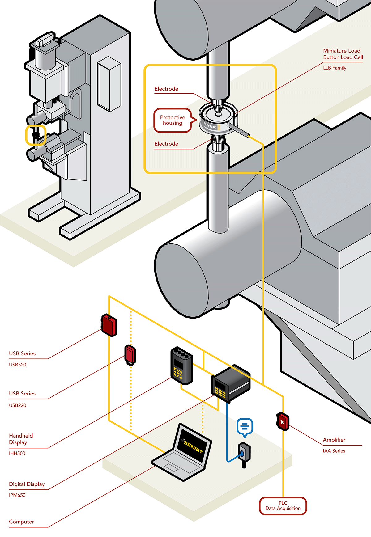 微型按钮测力传感器(LLB系列),与相关的仪器仪表IAA系列、IHH500、IPM650、US520或者USB220及SENSITTM软件。