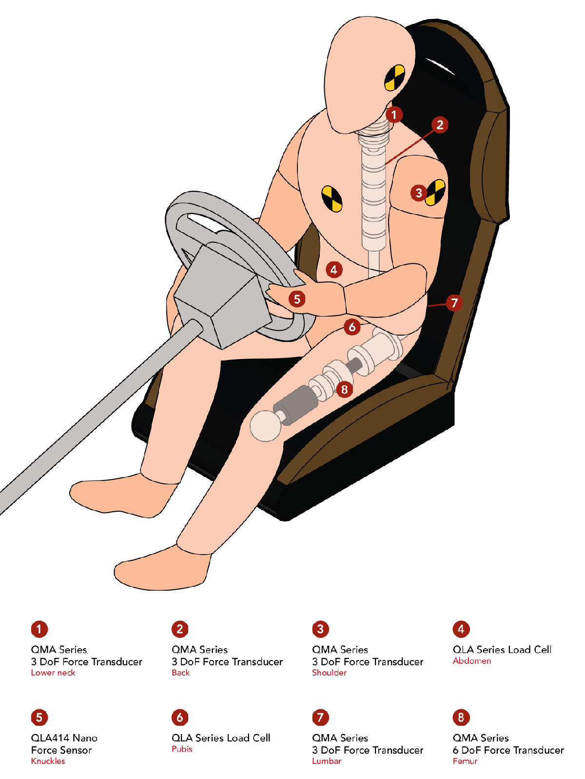 碰撞试验用的人体模型 – 通常也叫做试验假人 (ATDs) – 是一种用在交通碰撞试验中反馈人体所遭受伤害的高精度汽车试验装置。 它可以模拟出在发生交通碰撞事故时人体各部位和关节所遭受力的方向和程度。在试验假人身体关键部位和肢体关节处安装有碰撞测试用的传感器, 同时装配有采集系统, 以记录不同情况碰撞时部位产生的偏移、 加速度和力。 例如, 试验假人躯干处的传感器记录其受到碰撞的合力程度和方向。 研究员和测试工程师用记录到的数据来分析和预测在碰撞中人体受到的伤害, 并研发更安全和更符合人体工程学的交通工具。在开发出碰撞试验假人之前, 曾经用过人类尸体、动物或者活人来测试交通碰撞时的安全性。 后来工程师们掌握了在假人模型上集成传感器来测量碰撞时力、 加速度、 冲击和位移的技术, 他们才能更好的去预测人体这样的伤害, 比如肋骨骨折、 胸部偏移、 脑震荡、 肢体骨折、 肌肉和软组织的伤害。一个碰撞试验假人上, 遍布集成有超过200个传感器, 包括力传感器、 扭矩传感器、 加速度传感器、 位移传感器。这类模型中具体会用到哪些传感器呢?在试验假人中, MK网官方站网页版_MK(中国)、 力-扭复合型传感器是少不了, 比如他们通常位于头颈、 背脊、 肩关节、 腹部、 指关节、 耻骨、 腰部和腿骨等部位。力-扭多轴传感器能及时地测出试验假人在多个方向受到的力矩大小和方向, 比如六轴传感器能测三维互相垂直的力 (Fx, Fy, Fz)、 以及绕着力方向产生的扭力 (Mx, My, Mz), 并转换成可测量的电子信号。MK网官方站网页版_MK(中国)提供了大量的力-扭传感器选项, 非常适合碰撞试验假人的应用。MK网官方站网页版_MK(中国)对内的技术精湛多样的工程师团队同时开发出了先进的、 独特的、 性能可靠的传感器和输出来满足你的应用需求。 MK网官方站网页版_MK(中国)力-扭多轴碰撞测试传感器符合美国国家高速公路交通安全管理局FMVSS 208的试验程序和安全要求。